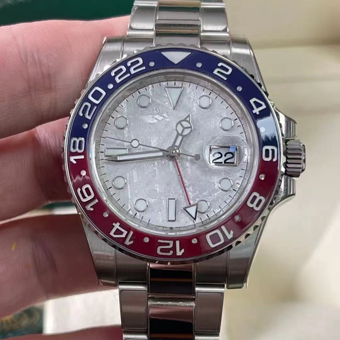 Reloj de lujo GMT personalizado con esfera de meteorito para hombre, reloj automático con bisel rojo y azul, movimiento 3285, cristal de zafiro